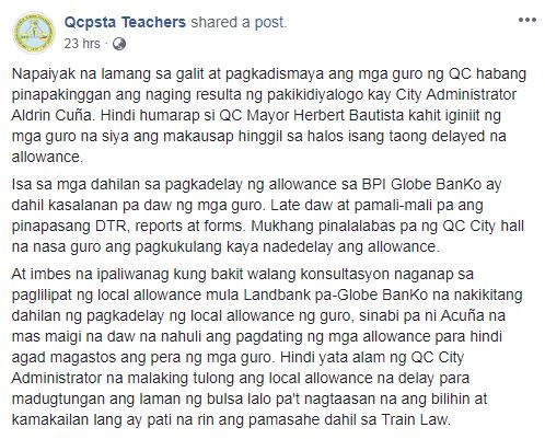 Rallyists were holding tarpaulins bearing the message, “Local Allowance, Ibalik sa Landbank.” They made an appeal to Mayor Herbert Bautista to return their local allowance payroll system back to Landbank from Globe Banko. The teachers said that since the transfer, their allowances were delayed by 6 months sometimes up to a year.